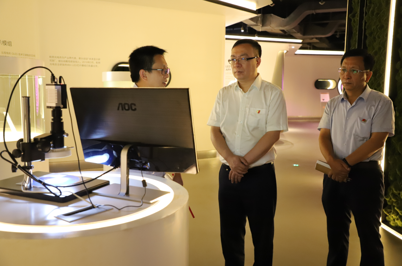 李书记一行,参观了公司展厅、党建活动室以及党建文化墙,详细了解了公司生产、经营以及党建活动情况。随后,调研组与乾照光电各级党组织委员、党员以及积极分子代表进行了座谈。