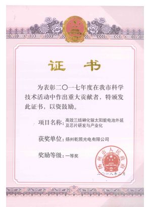 日前,扬州市政府公布了2017年度科学技术奖获奖情况。扬州乾照光电有限公司申报的“高效三结砷化镓太阳电池外延及芯片研发与产业化”项目,在众多优秀成果中脱颖而出,荣获扬州市科技进步奖一等奖。
