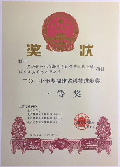 八、10月31日,福建省人民政府发文公布《2017年度福建省科学技术奖励和专利奖励的决定》。乾照光电与厦门大学、厦门华联电子股份有限公司、厦门光莆电子股份有限公司联合申报的“多场调控化合物半导体量子结构关键技术及其固态光源应用”从454项科技进步奖项目中脱颖而出,荣获福建省科技进步奖一等奖。