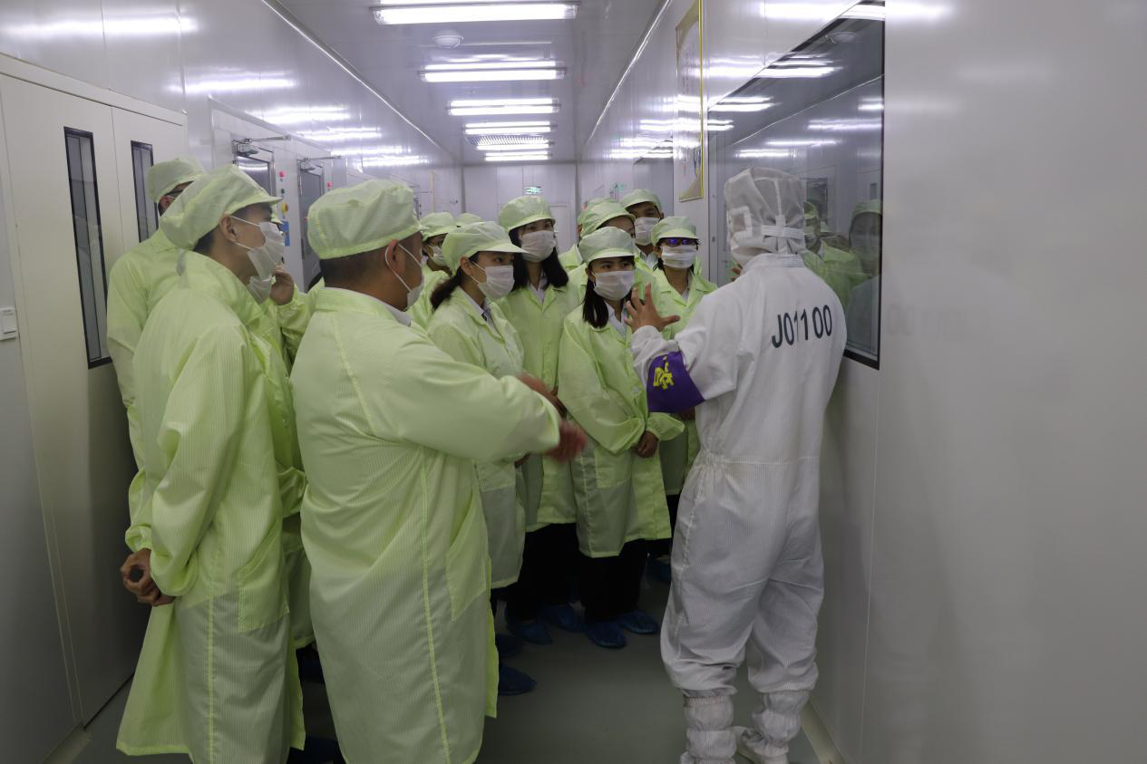 在展厅,学研班学员们了解了公司的企业文化、主要产品以及江西乾照光电的未来规划。在生产车间,学员们观摩了外延片的生长、检测工艺流程,了解了芯片生产的全过程以及相关设备的功能介绍,特别是在芯片目检站,学员们通过显微镜近距离观察放大的芯片时,纷纷发出了惊叹声。