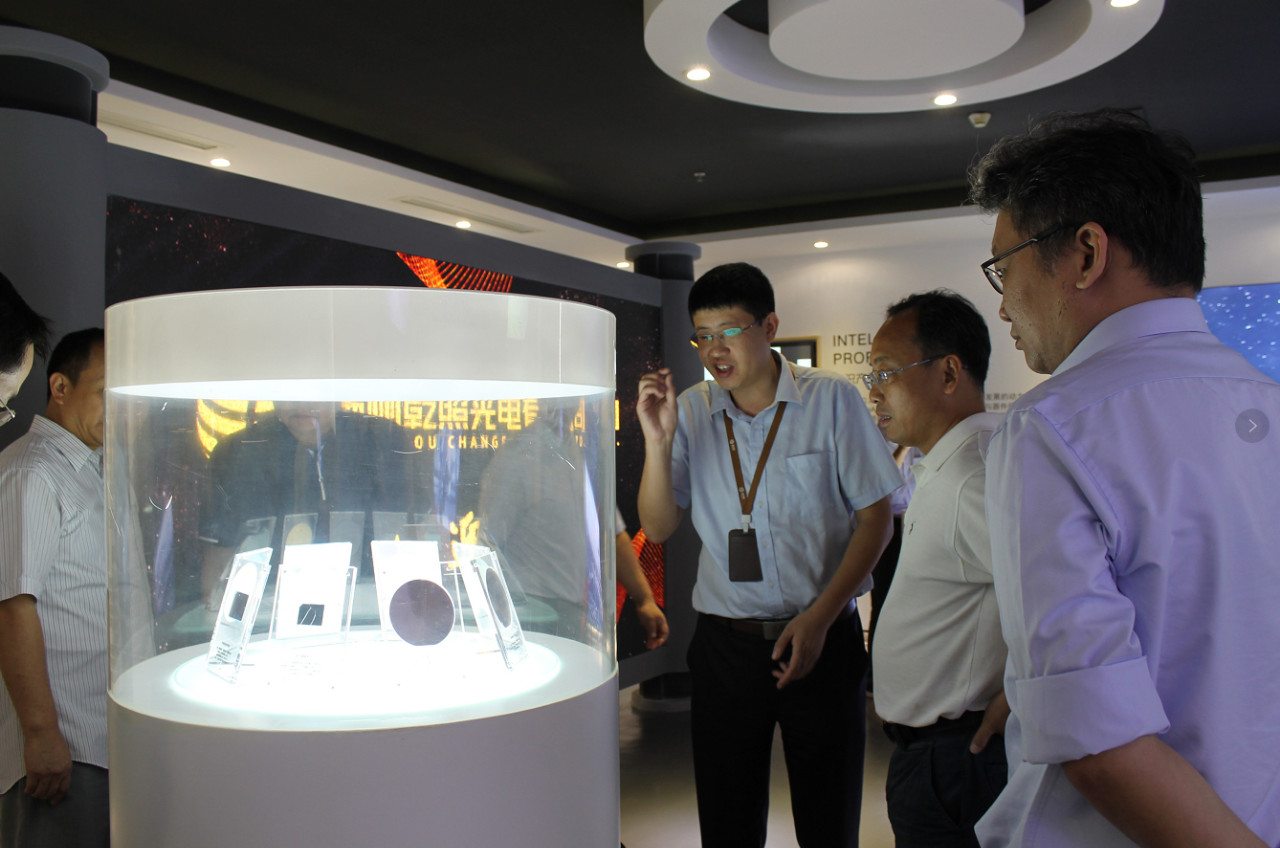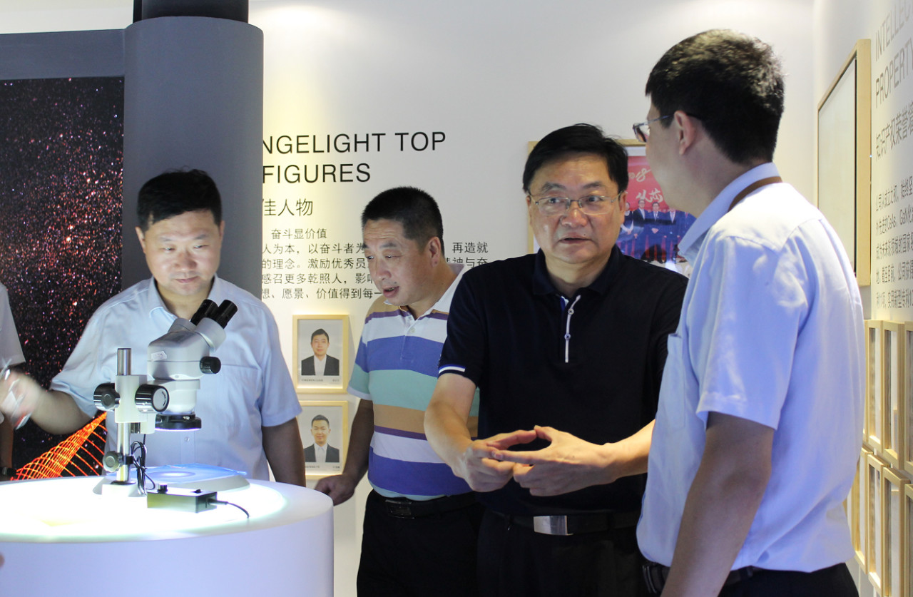 随后,巡视组一行参观了公司展厅。马祥柱为大家讲述了扬州乾照光电创业十年的历程、成绩以及荣誉,并介绍了公司各类产品的型号、样式以及应用领域。巡视组成员们通过显微镜观察了公司芯片成品芯粒,对一片四寸圆片能切出几十万颗芯粒的生产工艺赞叹不已。
