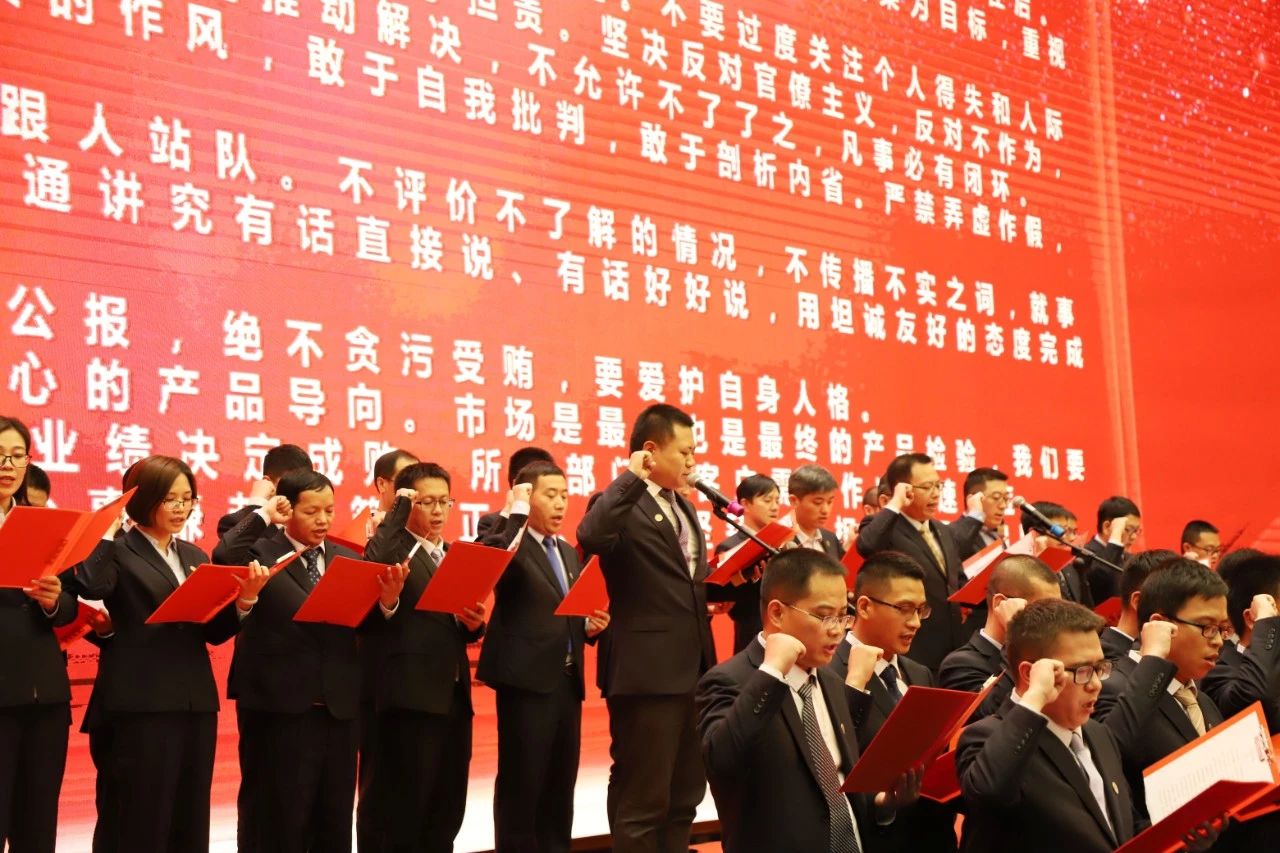 表彰结束,董事长金章育,总裁蔡海防带领着公司经理层以上管理人员,面对全体员工庄严宣誓。随后,金章育董事长进行致辞发言,他以“一心”、“砥砺”、“同袍”三个关键词完美诠释了本次尾牙的主题。他希望全体乾照人都能够理解与践行“同袍一心,砥砺前行”,铸铁军,展鸿路。最后,股东代表三盛资本总裁王建辉先生作嘉宾致辞,他回忆了自身也曾经历过的艰难时期,表示寒冬并不可怕,众志成城,则为崛起之势,看好乾照的未来。