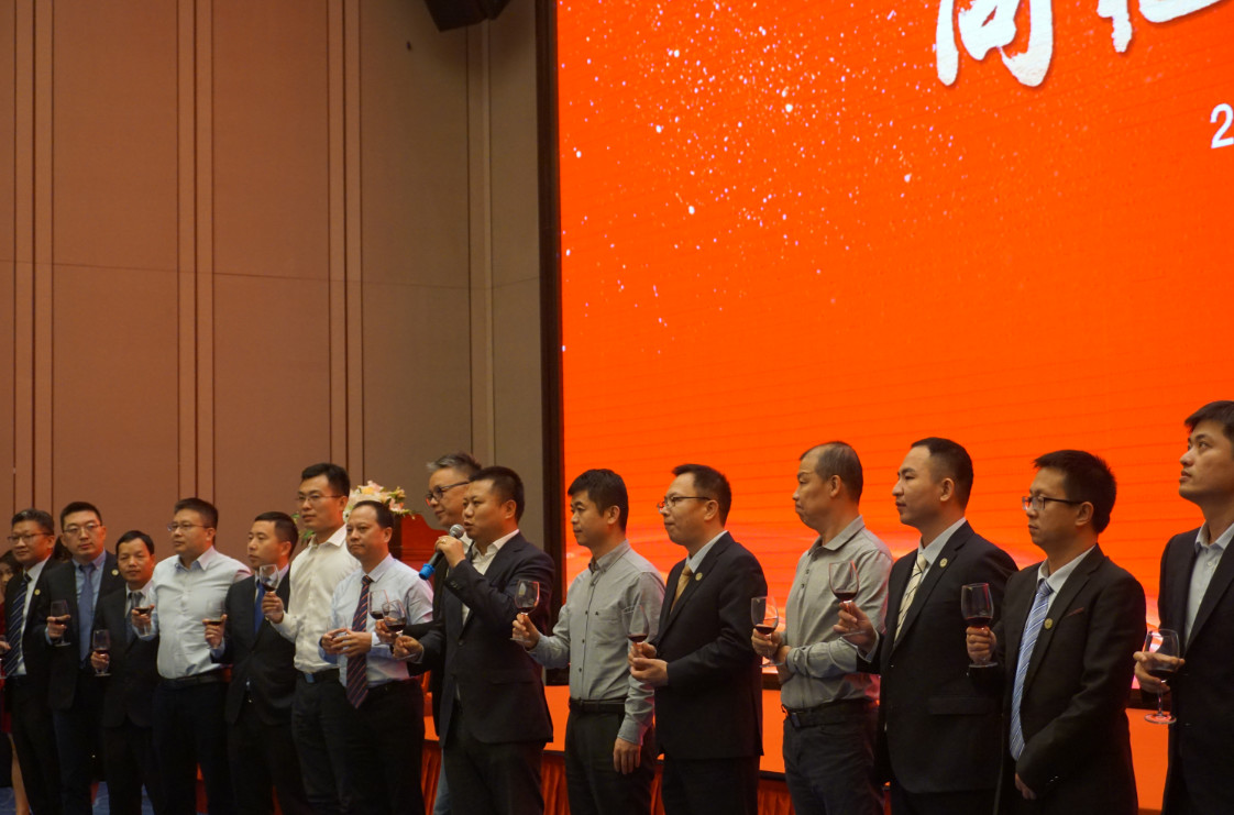 领导致辞后,晚宴正式开始。金章育董事长和嘉宾一起,携公司高管上台致祝酒词。今夜,我们共同举杯,敬过往,也敬未来!
