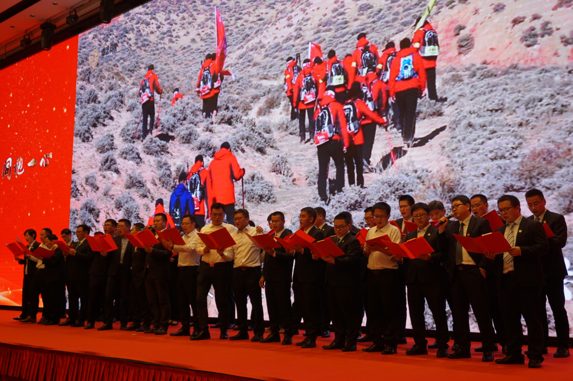 为增加晚宴欢庆气氛,集团总部尾牙晚宴特别安排了庆生环节,为全体12月生日员工共贺诞辰。董事长金章育作为寿星代表与寿星们一同切蛋糕做游戏。最后,参与张掖徒步的高管们共同上台,合唱一曲《壮志在我胸》,将晚宴现场推向高潮。