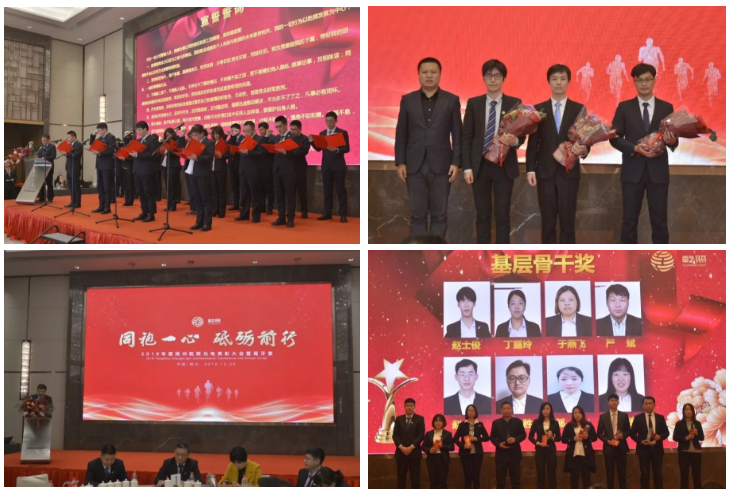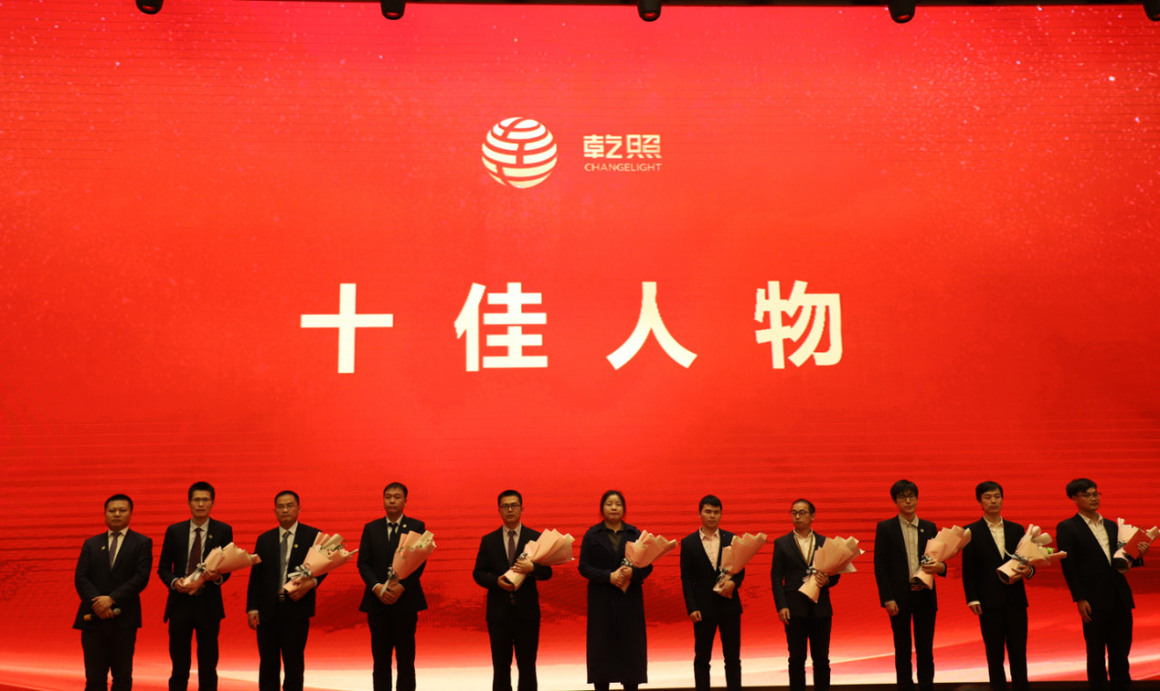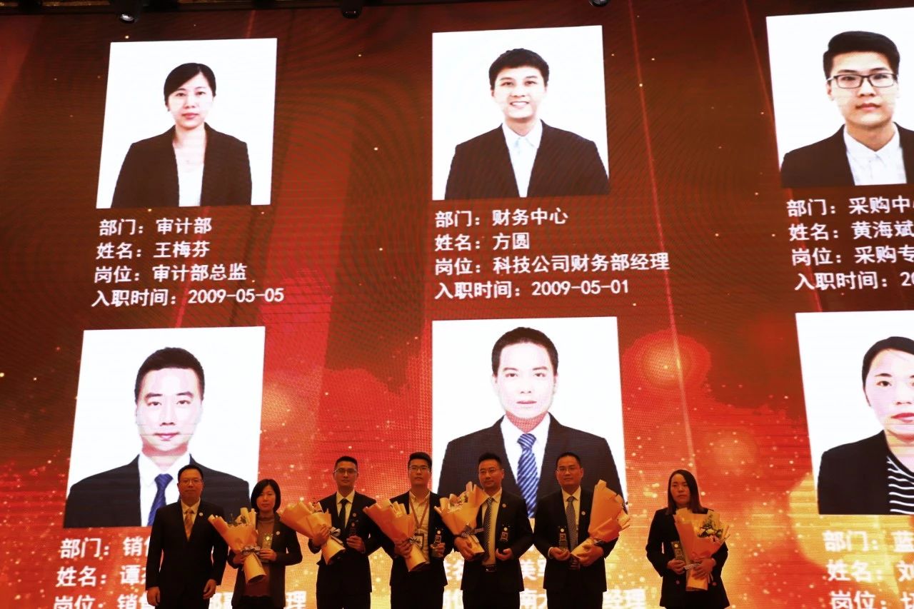 总结报告后,公司对2019年工作中表现突出的个人和团队进行了表彰。此次表彰共设置了最佳新人奖、基层骨干奖,技术精英奖、管理卓越奖、优秀部门奖、优秀班组奖、科技进步奖、十年员工、党支部优秀党员奖、“乾照十佳人物”等十大奖项,共计79人获个人奖项,12个团队获团体奖项。按照往年惯例,“乾照十佳人物”的颁奖环节由董事长金章育亲自主持并为获奖人员一一颁奖,总裁蔡海防为十年员工颁发十年纪念金币。