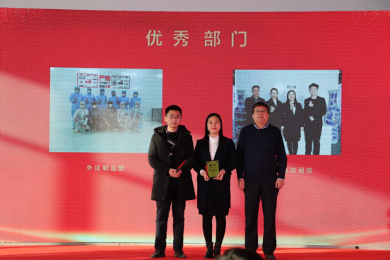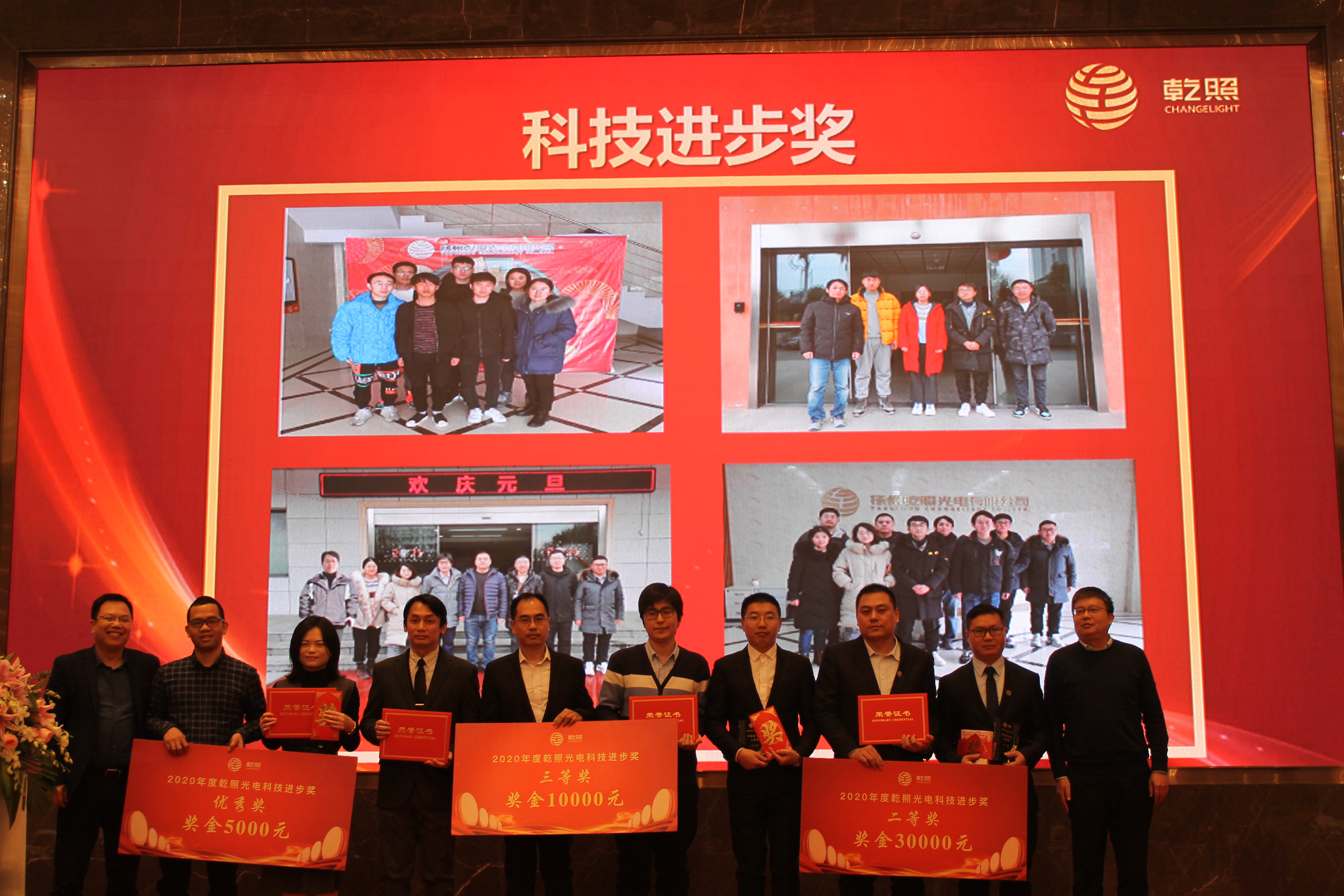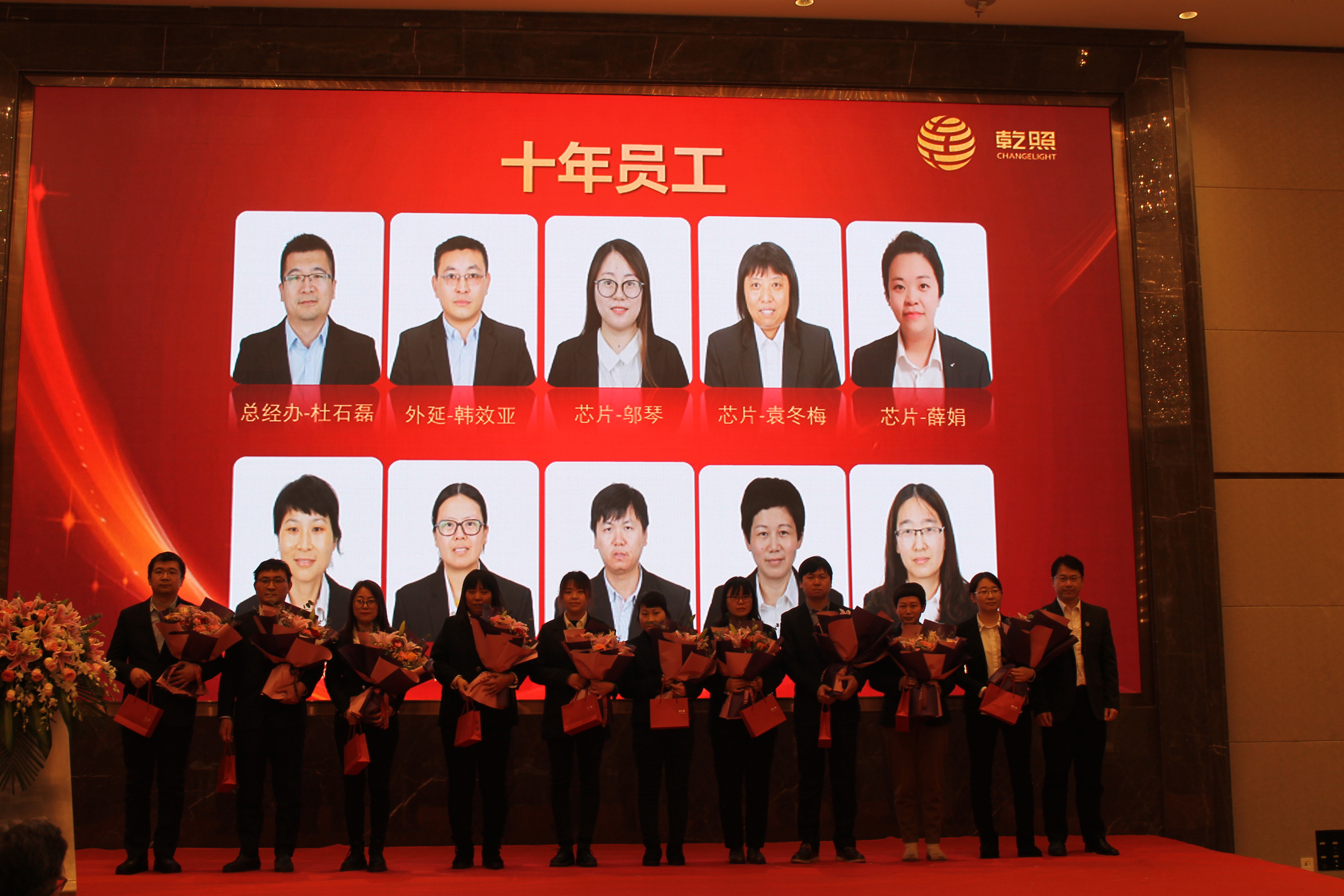 总结报告后,公司对2020年工作中表现突出的个人和团队进行了表彰。此次表彰共设置了最佳新人奖、基层骨干奖,技术精英奖、管理卓越奖、优秀部门奖、优秀班组奖、科技进步奖、十年员工、安全评优、党支部优秀党员奖、“乾照十佳人物”等多类奖项。金章育为十佳人物一一颁奖,蔡海防为十年员工颁发十年纪念金币。