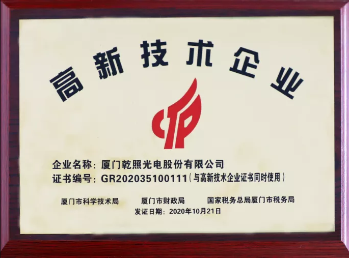 12月,乾照光电收到厦门市科学技术局、厦门市财政局、国家税务总局厦门市税务局联合颁发的《高新技术企业证书》,证书编号为GR202035100111,发证日期为2020年10月21日,有效期三年。公司于2008年被认定为高新技术企业,本次是公司原高新技术企业证书有效期满后进行的重新认定。这是对公司具有高成长性、较好潜在经济效益的认可,也是对公司具备较强的创新意识、较高的市场开拓能力和经营管理水平的高度认可。乾照光电将充分发挥高新技术企业的优势和模范带头作用,进一步提高自主创新的能力,提升产品技术和质量!