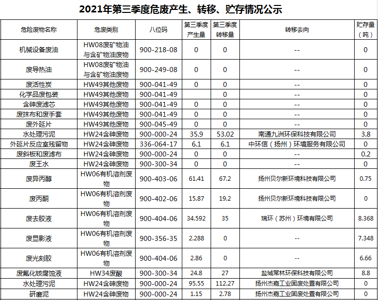 扬州乾照光电有限公司2021年第三季度危废产生、转移、贮存情况公示