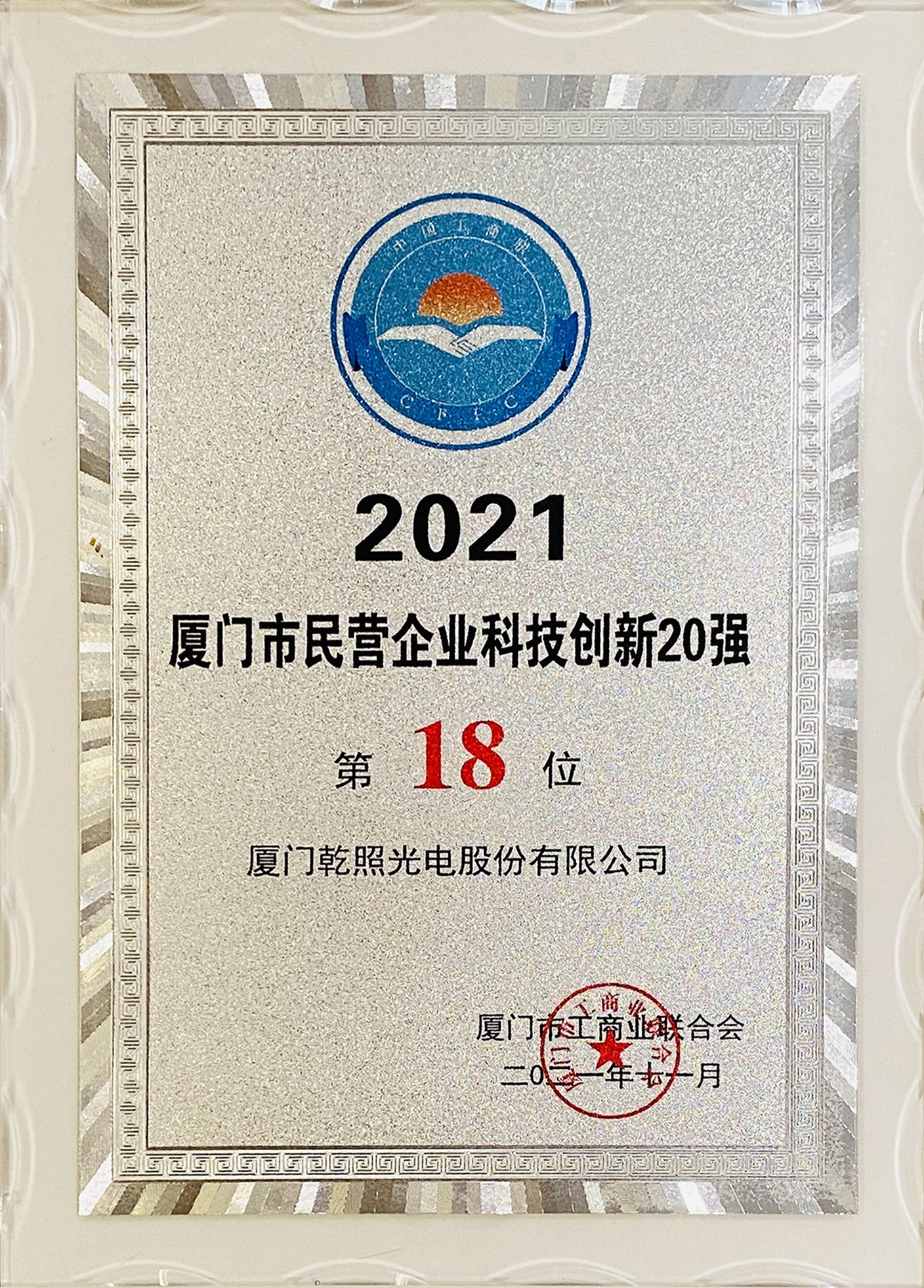 11月1日,厦门市工商联(总商会)召开厦门市民营企业百强发布会。本次厦门市民营企业百强评选共有239家企业参评,涵盖面广代表性强。厦门乾照光电股份有限公司荣获“2021厦门市民营企业100强”,成功入榜“2021厦门市民营企业科技创新20强”。