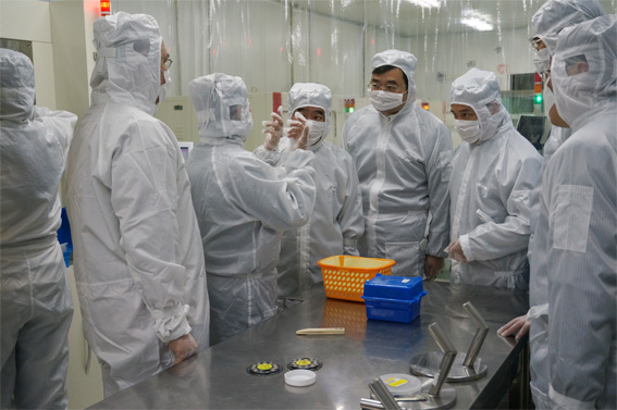 扬州市委组织部来我司调研 来源: 发布时间:2014-11-19 2014年11月19日下午,在经济开发区管委会主任季允丰的陪同下,扬州市委组织部部长张爱军等一行6人来我司调研,并对我扬州乾照光电有限公司引进的高层次人才给予了高度的认可。 此次调研,我们陪同市委组织部的领导们参观了芯片车间的工艺流程,并做了简单的工艺介绍。为了能够近距离的了解到我们的产品,在开发区管委会主任季允丰的陪下,同市委组织部部长张爱军等一行6人便穿着无尘服前去外研车间近距离的观察、了解我们的产品及性能介绍,并对我扬州乾照光电有限公司引进的高层次人才给予了高度的认可。