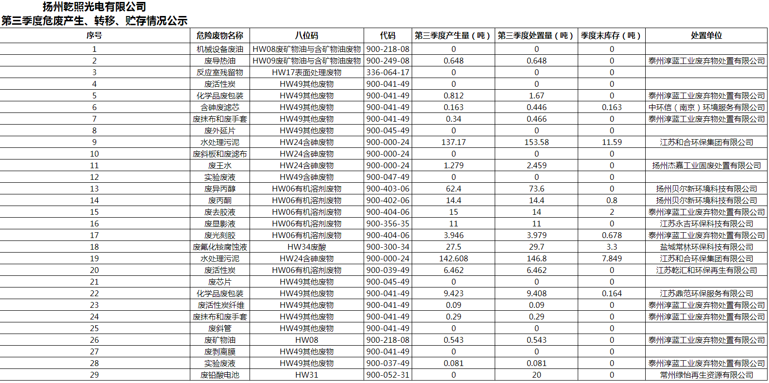 扬州乾照光电有限公司2023年第三季度危废产生、转移、贮存情况公示