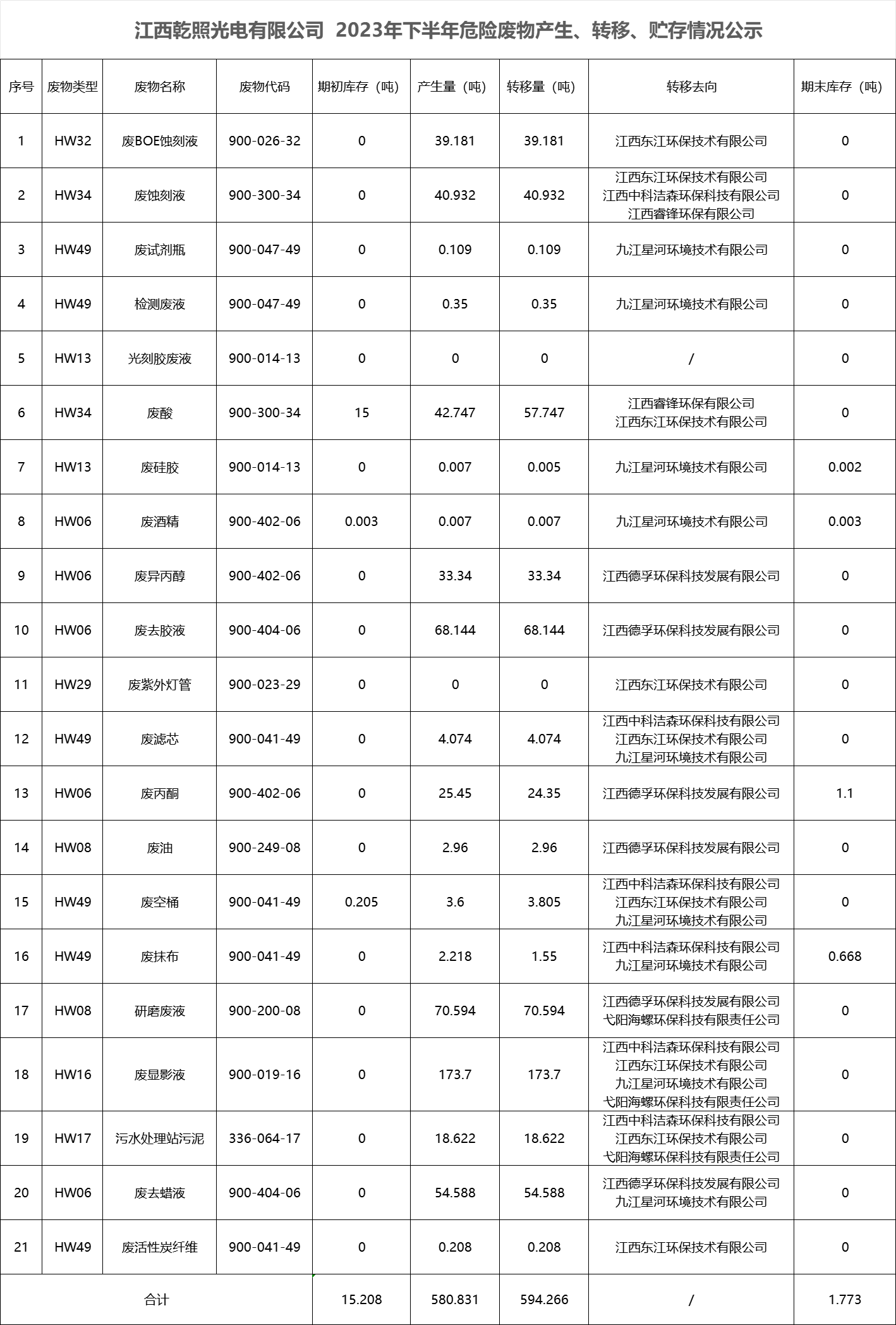 江西乾照光电有限公司 2023年下半年危险废物产生、转移、贮存情况公示