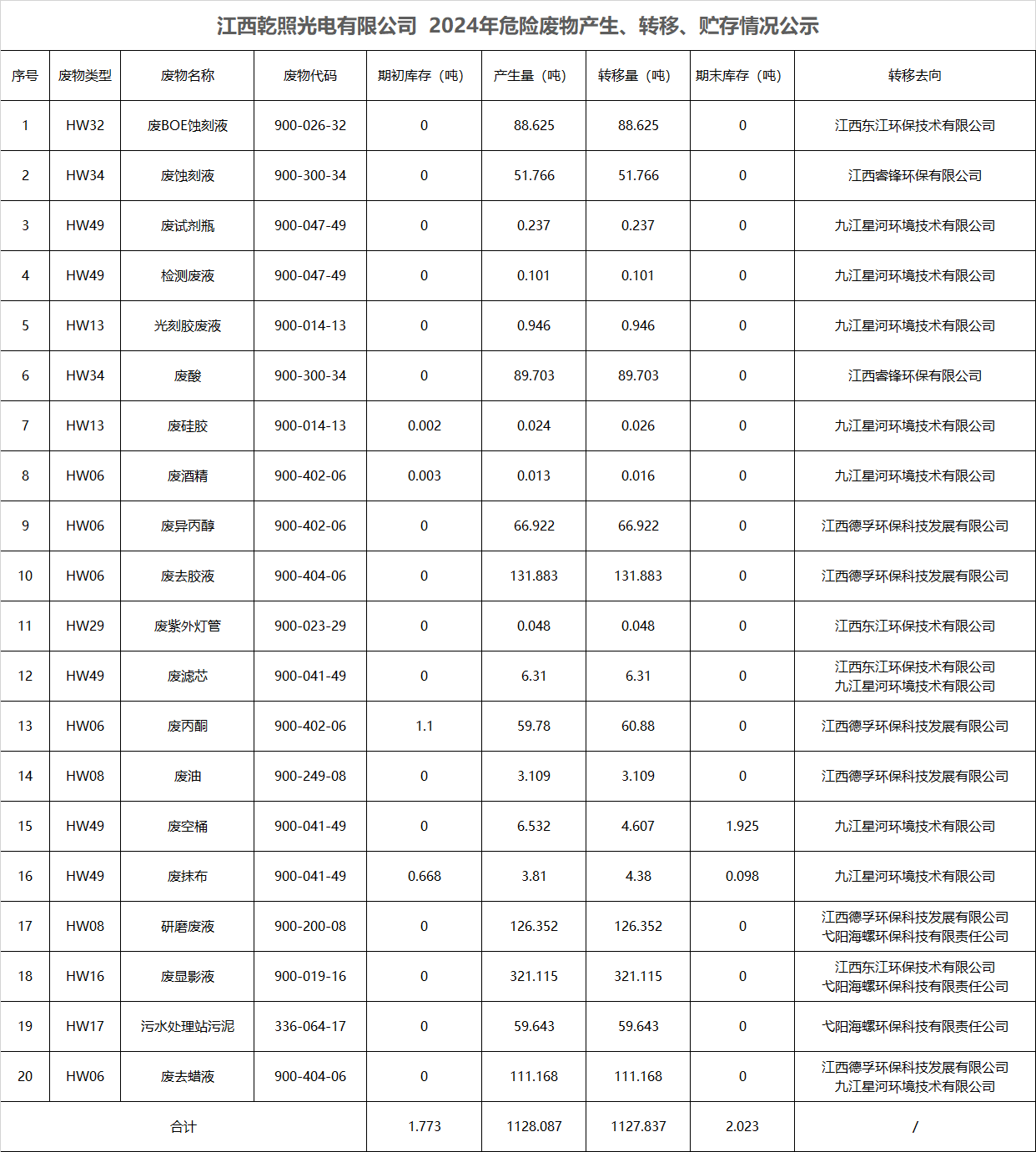 江西乾照光电有限公司 2024年危险废物产生、转移、贮存情况公示