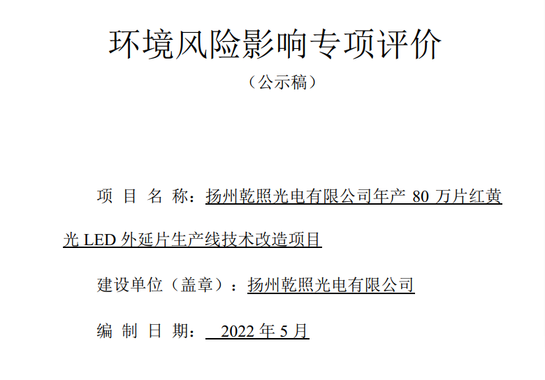扬州乾照光电有限公司年产80万片红黄光LED外延片生产线技术改造项目环境风险影响专项评价公示稿