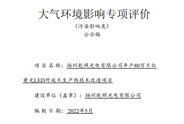 扬州乾照光电有限公司年产80万片红黄光LED外延片生产线技术改造项目大气环境影响专项评价公示稿