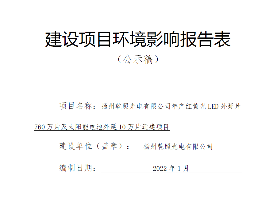 《扬州乾照光电有限公司年产红黄光LED外延片760万片及太阳能电池外延10万片迁建项目环境影响报告表公示稿》 /uploadfiles/2022/04/20220402144205425.pdf 《扬州乾照光电有限公司年产红黄光LED外延片760万片及太阳能电...