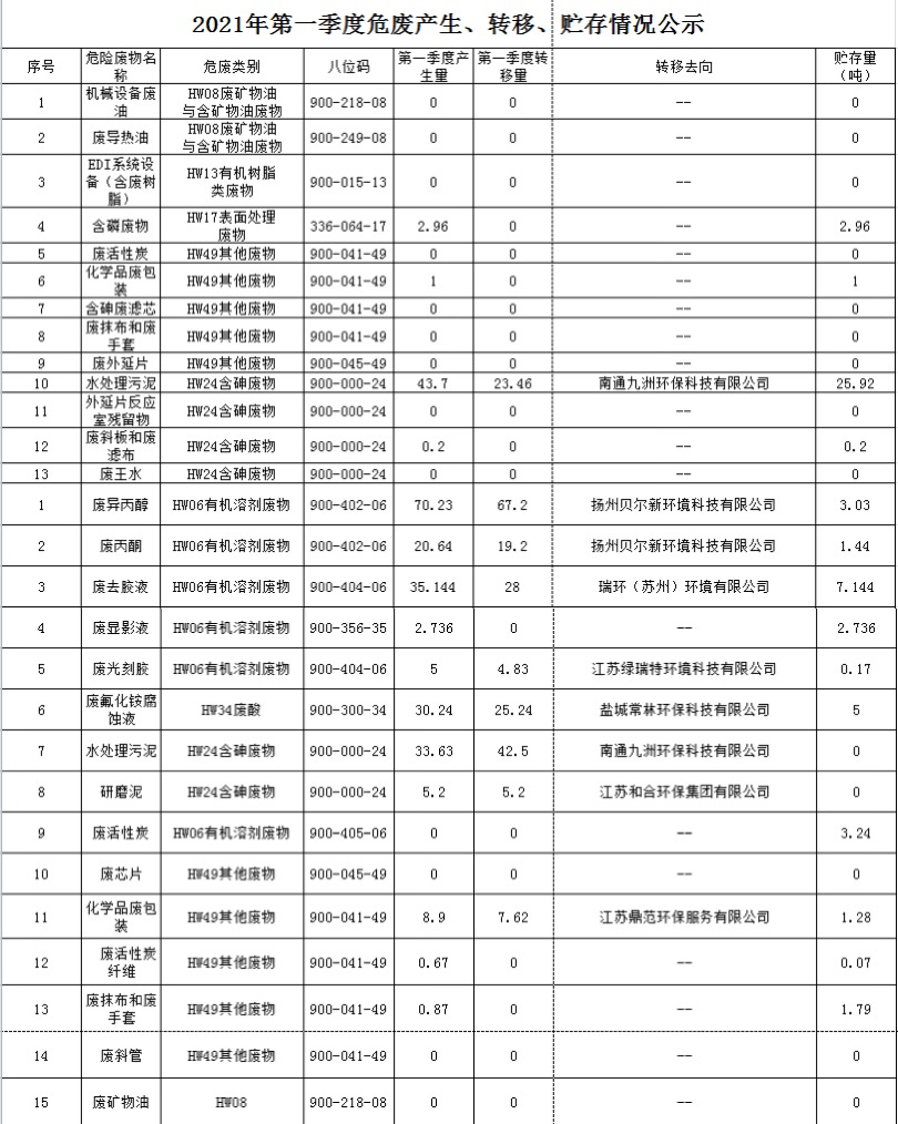 扬州乾照光电有限公司2021年第一季度危废产生、转移、贮存情况公示