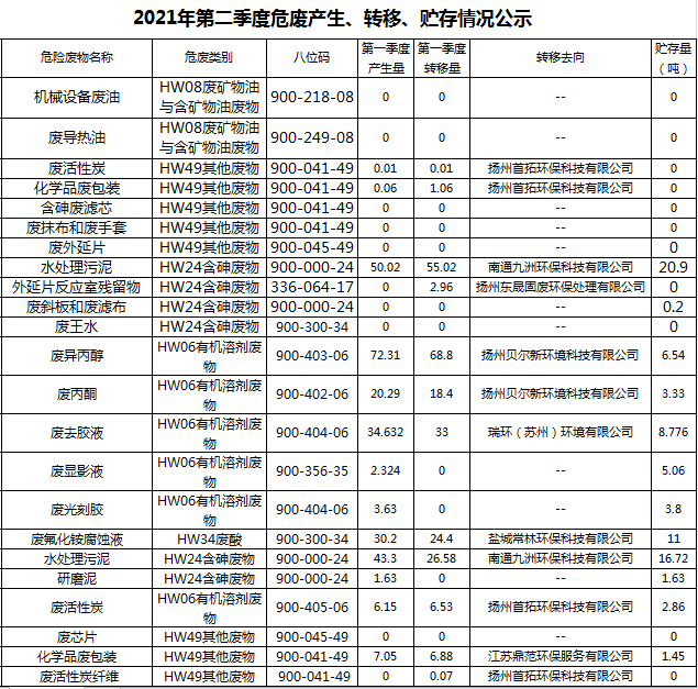 扬州乾照光电有限公司2021年第二季度危废产生、转移、贮存情况公示