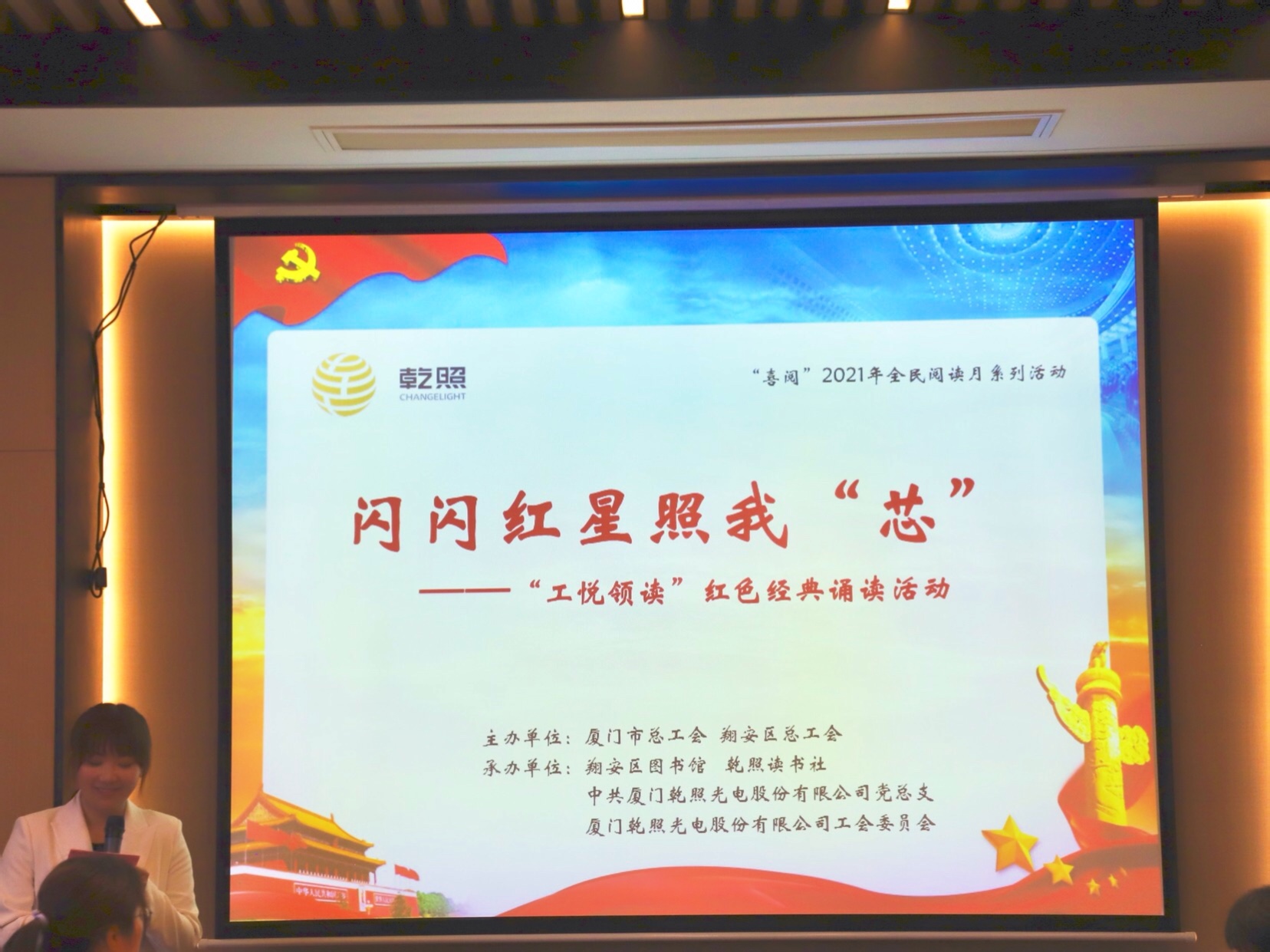 厦门市总工会宣教部部长吴红霞莅临活动现场,乾照光电工会主席刘文辉、党总支书记蔡建九、副总裁牛兴盛以及公司部分党员、读书社成员出席本次活动。