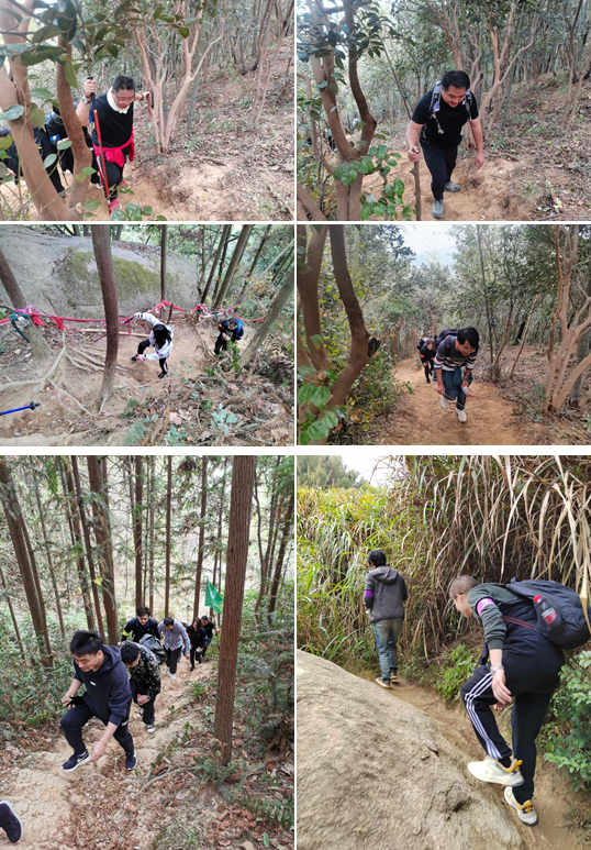 陡峭的山路,嶙峋的怪石路障,近乎垂直的崖壁……老四坡顾名思义四个坡,一个坡比一个坡险峻,难度远比大家预想的艰巨。乾照精英们并没退缩,成员间相互鼓励,相互扶持,大家带着信念的战旗,一路爬坡,一路登顶。风声、脚步声、呼吸声、加油声,大家感受着来自团队的力量。中午在雷公坛汇合,短暂的就餐休整后,各参赛队伍重回赛道,奋进再出发,最终顺利完成余下的挑战。